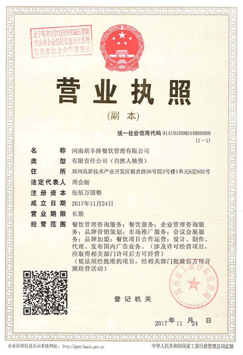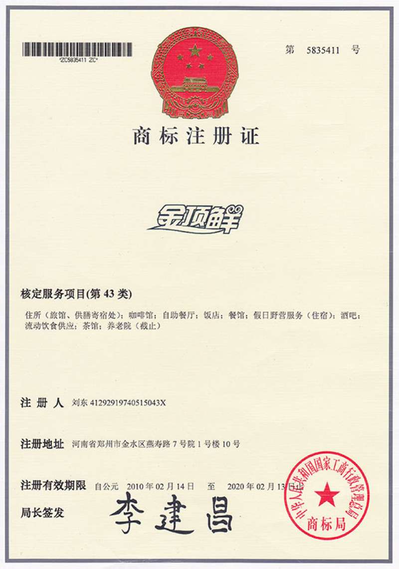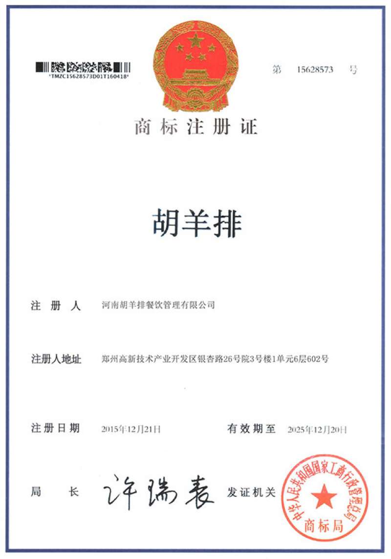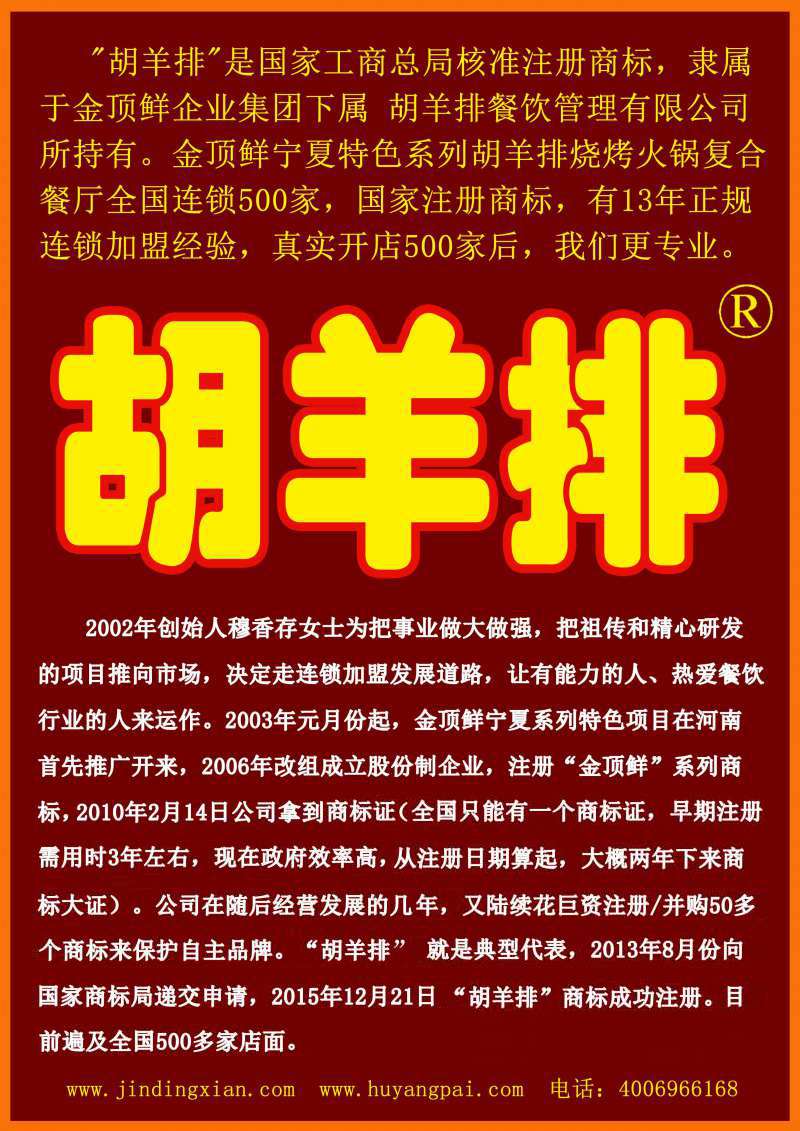 2002年穆香存女士為把事業(yè)做大做強,把精心研發(fā)的項目推向市場,決定走連鎖加盟發(fā)展道路,讓有能力的人、熱愛餐飲行業(yè)的人來運作。2003年元月份起,金頂鮮寧夏系列特色項目在河南先推廣開來,2006年改組成立股份制企業(yè),注冊“金頂鮮”系列商標(biāo),2010年2月14日公司拿到商標(biāo)證(早期注冊需用時3年左右,現(xiàn)在效率高,從注冊日期算起,大概兩年下來商標(biāo)大證)。公司在隨后經(jīng)營發(fā)展的幾年,又陸續(xù)花巨資注冊/并購50多個商標(biāo)來保護自主品牌。“胡羊排“就是典型代表,2013年8月份向國家商標(biāo)局遞交申請,2015年12月21日“胡羊排”商標(biāo)成功注冊。目前遍及河南、河北、山西、山東、安徽、浙江、江蘇、陜西、廣西、東北、甘肅、江西、四川、新疆等省份,已擁有500余家加盟分店。