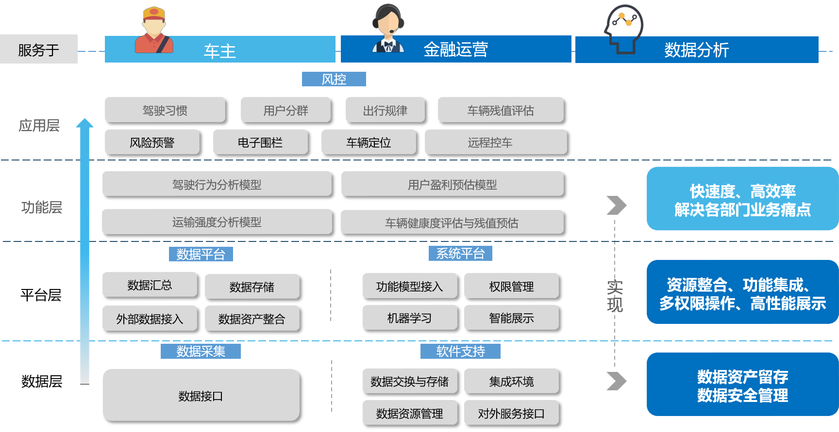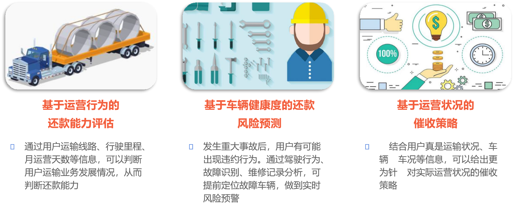 車聯(lián)網數據風控方案,可以及時掌握用戶運營狀況、評估盈利與還款能力, 將傳統(tǒng)的違約后被動催收轉變?yōu)檫€款前提前預警,催收工作更主動,風險更可控。