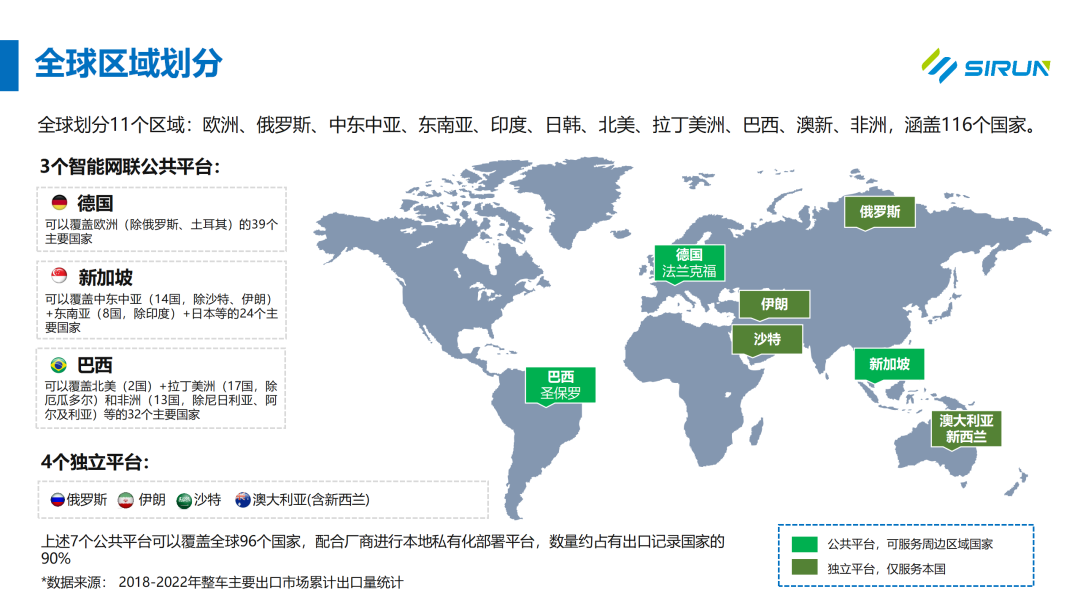 自成立以來(lái),斯?jié)櫶炖室褏f(xié)助國(guó)內(nèi)車(chē)企成功交付多個(gè)海外項(xiàng)目,涵蓋北美、俄羅斯、歐洲、中東及東南亞等地。通過(guò)對(duì)主要汽車(chē)出口目標(biāo)國(guó)的出口份額占比分析,同時(shí)結(jié)合斯?jié)櫶炖实暮M忭?xiàng)目落地經(jīng)驗(yàn)和全球主要國(guó)家的數(shù)據(jù)法規(guī)調(diào)研結(jié)果,我們發(fā)現(xiàn),在德國(guó)、新加坡、巴西、俄羅斯、伊朗、沙特和澳大利亞等國(guó)構(gòu)建智能網(wǎng)聯(lián)開(kāi)放平臺(tái)可以覆蓋90%以上的汽車(chē)出口目標(biāo)國(guó)家,實(shí)現(xiàn)快速全球化布局。便捷的車(chē)輛接入模式使得自主品牌車(chē)企能以較快的速度實(shí)現(xiàn)在出海目的地的網(wǎng)聯(lián)覆蓋,有效幫助車(chē)企在海外市場(chǎng)降低成本,提高產(chǎn)品競(jìng)爭(zhēng)力,實(shí)現(xiàn)智能化出海的愿景。