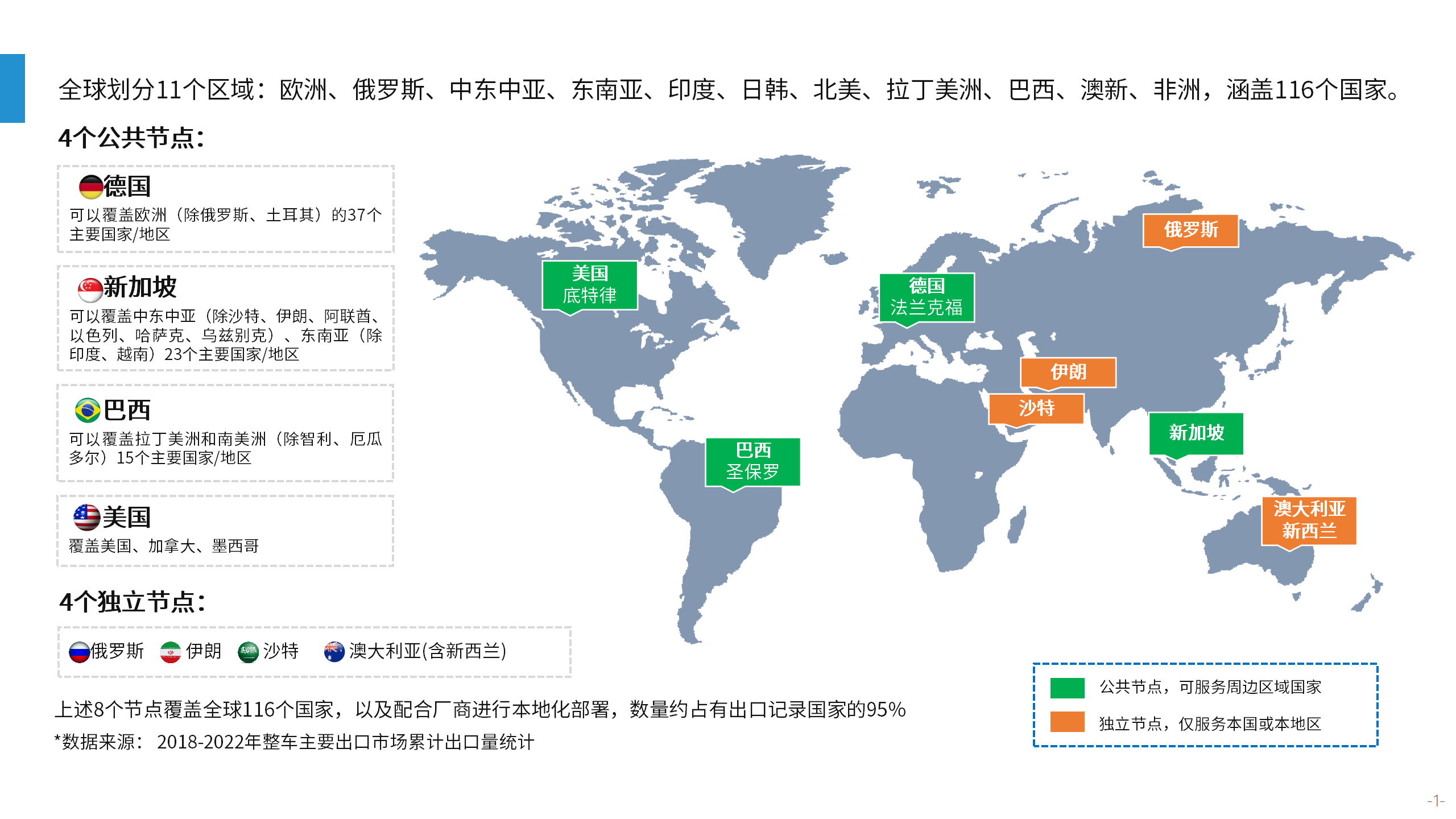 在全球化戰(zhàn)略布局中,斯?jié)櫶炖示臉?gòu)建了4個公共節(jié)點,分別位于德國、新加坡、巴西及美國,并額外設(shè)立4個獨立節(jié)點,覆蓋俄羅斯、伊朗、沙特以及澳大利亞(含新西蘭),總計覆蓋全球11個區(qū)域、116個國家。我們提供全面的跨境對接服務(wù)、確保數(shù)據(jù)合規(guī)性、產(chǎn)品認證等智能網(wǎng)聯(lián)領(lǐng)域的配套服務(wù),以滿足全球客戶的多樣化需求。