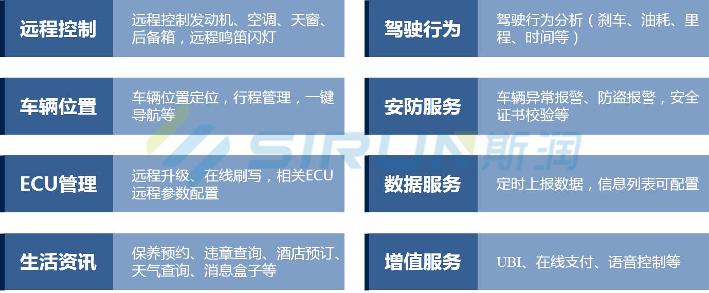 T-Box 作為無線網(wǎng)關(guān)為整車提供遠(yuǎn)程通訊接口,可以提供行車數(shù)據(jù)采集、行駛軌跡記錄、車輛故障監(jiān)控、車輛遠(yuǎn)程控制(開閉鎖、空調(diào)控制、車窗控制、發(fā)送機(jī)扭矩限制、發(fā)動(dòng)機(jī)啟停)、駕駛行為分析、4G 無線熱點(diǎn)分享等服務(wù)。