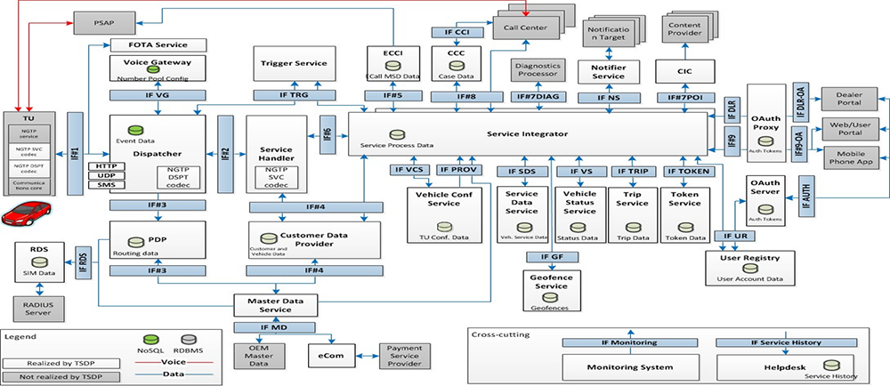 TSP提供實(shí)際的服務(wù),并作為對所有的需要執(zhí)行服務(wù)發(fā)布的系統(tǒng)的集成點(diǎn)。TSP的作用主要有兩個:第一是要發(fā)布語音和數(shù)據(jù)服務(wù)給TU;第二是發(fā)布內(nèi)容,諸如地圖數(shù)據(jù)和景點(diǎn)(POIs)內(nèi)容給Call Center。一個TSP能夠連接多個內(nèi)容提供商和呼叫中心。